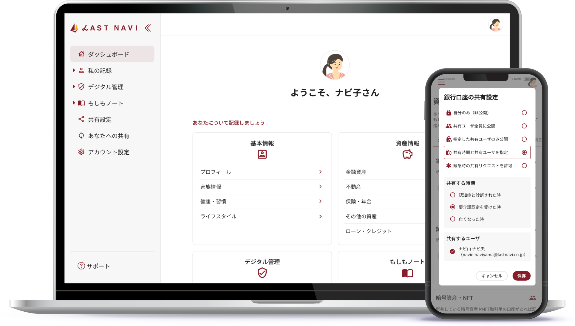 あなたの基本情報や資産、デジタルアカウントなどを一元管理できるノート機能です。デジタルだから、スマホやPCからいつでも、何度でも更新可能。終活の第一歩を、もっと気軽に始められます。